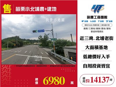 《詠騰工商團隊》 專營桃園工業地廠房出租出售 案名:苗栗小北埔農+建地 [價格]:6980萬 [坪數]:約14137坪【權狀+增建坪數】 [地理位置]:近三灣老街