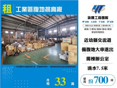《詠騰工商團隊》 專營桃園工業地廠房出租出售 案名:工業區腹地挑高廠房 [租金]:33萬 [坪數]:約700坪【權狀+增建坪數】 [地理位置]:近交流道