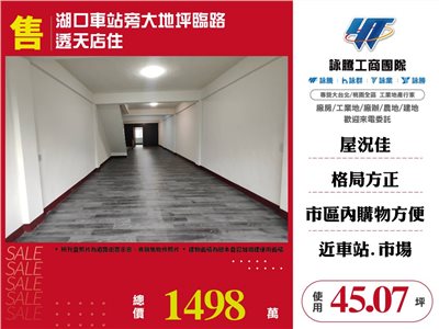 《詠騰工商團隊》 專營桃園房地產出租出售 案名:湖口車站旁大地坪臨路透天店住 [價格]:1498萬 [坪數]:約45.07坪【權狀+增建坪數】 [地理位置]:近湖口車站