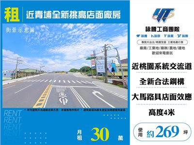 《詠騰工商團隊》 專營桃園工業地廠房出租出售 案名:近青埔全新挑高店面廠房 [租金]:30萬 [坪數]:約269坪【權狀+增建坪數】 [地理位置]:近桃園系統交流道