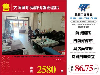 《詠騰工商團隊》 專營桃園房地產出租出售 案名:大溪國小旁前後臨路透店 [價格]:2580萬 [坪數]:約86.75坪【權狀+增建坪數】 [地理位置]:近大溪老街