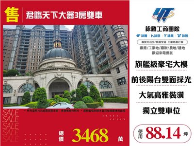 《詠騰工商團隊》 專營桃園房地產出租出售 案名:君臨天下大器3房雙車 [價格]:3468萬 [坪數]:約88.14坪【權狀+增建坪數】 [地理位置]:近忠勇公園