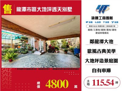 《詠騰工商團隊》 專營桃園房地產出租出售 案名:龍潭市區大地坪透天別墅 [價格]:4800萬 [土地坪數]:約115坪【權狀+增建坪數】 [建物使用面積]:約68坪【權狀+增建坪數】 [地理位置]:龍潭市區