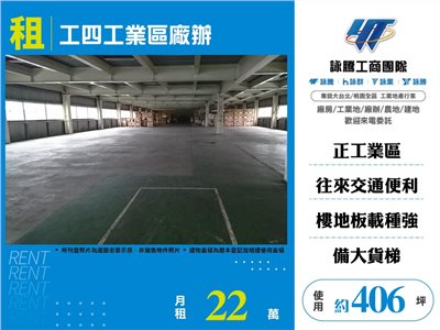 《詠騰工商團隊》 專營桃園工業地廠房出租出售 案名:工四工業區廠辦 [租金]:22萬 [坪數]:約406坪【權狀+增建坪數】 [地理位置]:工四工業區
