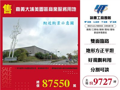 《詠騰工商團隊》 專營桃園工業地廠房出租出售 案名:嘉義大埔美園區商業服務用地 [價格]:87550萬 [坪數]:約9727坪 [周邊]:大埔美園區