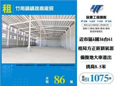 《詠騰工商團隊》 專營桃園工業地廠房出租出售 案名:竹南鋼構挑高廠房 [租金]:86萬 [坪數]:約1075坪 [周邊]:竹南市區