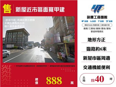 《詠騰工商團隊》 專營桃園工業地廠房出租出售 案名:新屋近市區面寬甲建 [價格]:888萬 [坪數]:約40坪 [周邊]:新屋市區