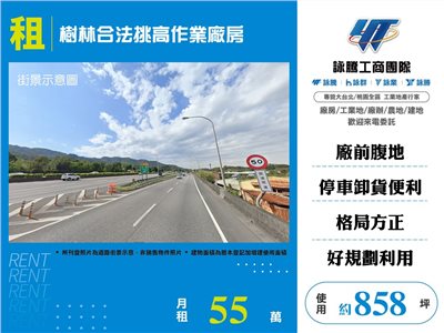 《詠騰工商團隊》 專營桃園廠房工業地出售出租 案名:樹林合法挑高作業廠房 [租金]:55萬 [坪數]:約858坪【權狀+空地+未登記增建坪數】 [交通]:土城交流道