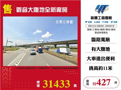 《詠騰工商團隊》 專營桃園廠房工業地出售出租 案名:觀音大腹地全新廠房 [價格]:31433萬 [坪數]:約427坪 [交通]:66快速道路