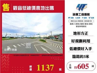 《詠騰工商團隊》 專營桃園工業地廠房出租出售 案名:觀音低總價農地出售 [價格]:1137萬 [坪數]:約605坪 [交通]:台15線