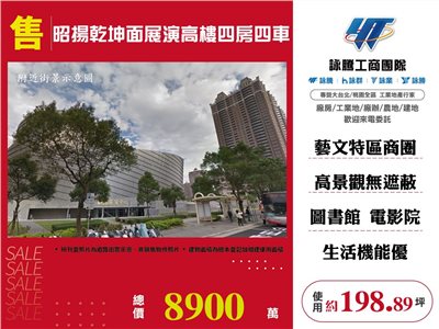 《詠騰工商團隊》 專營桃園房地產出租出售 案名:昭揚乾坤面展演高樓四房四車 [價格]:8900萬 [坪數]:約198.89坪 [周邊]:藝文特區