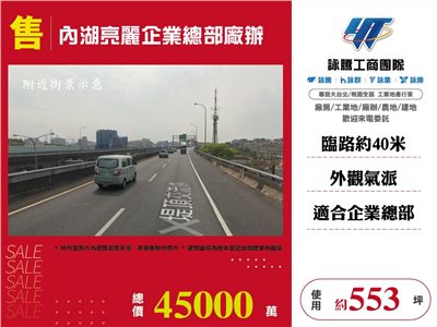 《詠騰工商團隊》 專營桃園廠房工業地出售出租 案名:內湖亮麗企業總部廠辦 [價格]:45000萬 [坪數]:約553坪【權狀+未登記增建坪數】 [交通]:堤頂交流道
