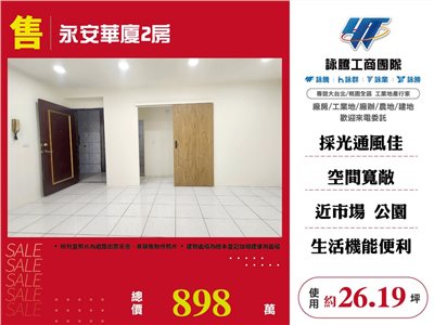 《詠騰工商團隊》 專營桃園房地產出租出售 案名:永安華廈2房 [價格]:898萬 [坪數]:約26.19坪 [周邊]:民族公園