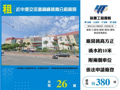 《詠騰工商團隊》 專營桃園廠房工業地出售出租 案名:近中壢交流道鋼構挑高分租廠房 [租金]:26萬 [坪數]:約380坪【權狀+未登記增建坪數】 [交通]:中壢交流道