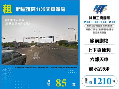 《詠騰工商團隊》 專營桃園廠房工業地出售出租 案名:新屋挑高11米天車廠房 [租金]:85萬 [坪數]:約1210坪【權狀+空地+未登記增建坪數】 [交通]: 66快速道路