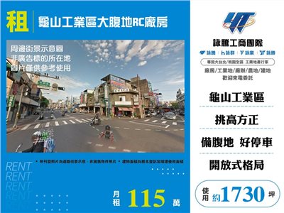 《詠騰工商團隊》 專營桃園工業地廠房出租出售 案名:龜山工業區大腹地RC廠房 [租金]:115萬 [坪數]:約1730坪【權狀+空地面積】 [周邊工業區]:龜山工業區