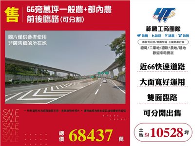 《詠騰工商團隊》 專營桃園工業地廠房出租出售 案名: 66旁萬坪一般農+都內農前後臨路(可分割) [價格]:68437萬 [坪數]:約10528坪 [地理位置]:近66快速道路
