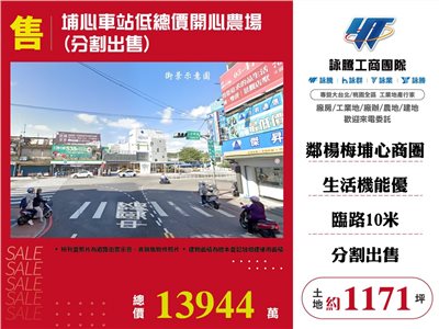 《詠騰工商團隊》 專營桃園工業地廠房出租出售 案名:埔心車站低總價開心農場(分割出售) [價格]:13944萬 [坪數]:約1171坪【權狀+增建坪數】 [地理位置]:近楊梅埔心商圈