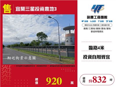 《詠騰工商團隊》 專營桃園工業地廠房出租出售 案名:宜蘭三星投資農地3 [價格]:920萬 [坪數]:約832坪【權狀+增建坪數】 [地理位置]:近台7縣