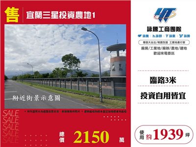 《詠騰工商團隊》 專營桃園工業地廠房出租出售 案名:宜蘭三星投資農地1 [價格]:2150萬 [坪數]:約5915坪【權狀+增建坪數】 [地理位置]:近台7縣