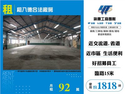 《詠騰工商團隊》 專營桃園工業地廠房出租出售 案名:租八德合法廠房 [租金]:92萬 [坪數]:約1818坪【權狀+增建坪數】 [地理位置]:近交流道
