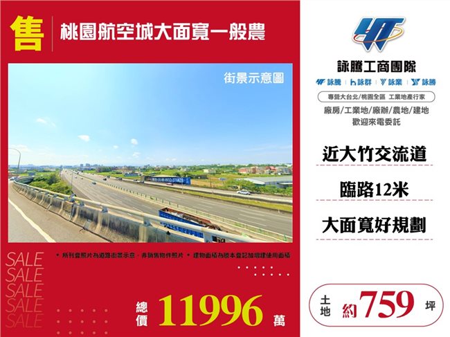 《詠騰工商團隊》 專營桃園工業地廠房出租出售 案名:桃園航空城大面寬一般農 [價格]:11996萬 [坪數]:約759坪 [地理位置]:近大竹交流道
