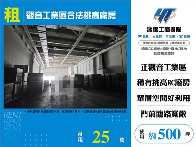 《詠騰工商團隊》 專營桃園工業地廠房出租出售 案名:觀音工業區合法挑高廠房 [租金]:25萬 [坪數]:約500坪【權狀+增建坪數】 [地理位置]:觀音工業區
