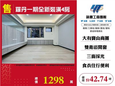 《詠騰工商團隊》 專營桃園房地產出租出售 案名:羅丹一期全新裝潢4房 [價格]:1298萬 [坪數]:42.74坪【權狀+增建坪數】 [地理位置:大有寶山商圈