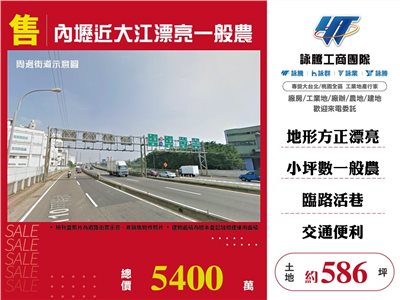 《詠騰工商團隊》 專營桃園工業地廠房出租出售 案名:內壢近大江漂亮一般農 [價格]:5400萬 [坪數]:約586坪【權狀+增建坪數】 [地理位置]:近交流道