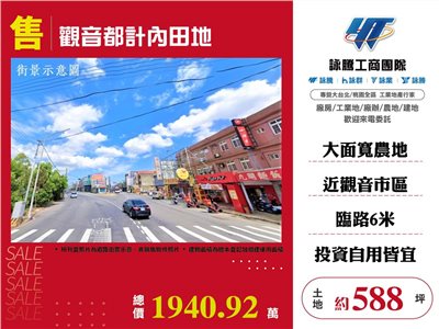 《詠騰工商團隊》 專營桃園工業地廠房出租出售 案名:觀音都計內田地 [價格]:1940.92萬 [坪數]:約588坪【權狀+增建坪數】 [地理位置]:近觀音市區