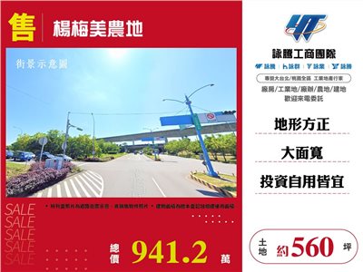 《詠騰工商團隊》 專營桃園工業地廠房出租出售 案名:楊梅美農地 [價格]:941.2萬 [坪數]:約560坪【權狀+增建坪數】 [地理位置]:近楊梅交流道