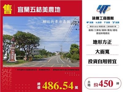 《詠騰工商團隊》 專營桃園工業地廠房出租出售 案名:宜蘭五結美農地 [價格]:486.54萬 [坪數]:約450坪【權狀+增建坪數】 [地理位置]:近市區